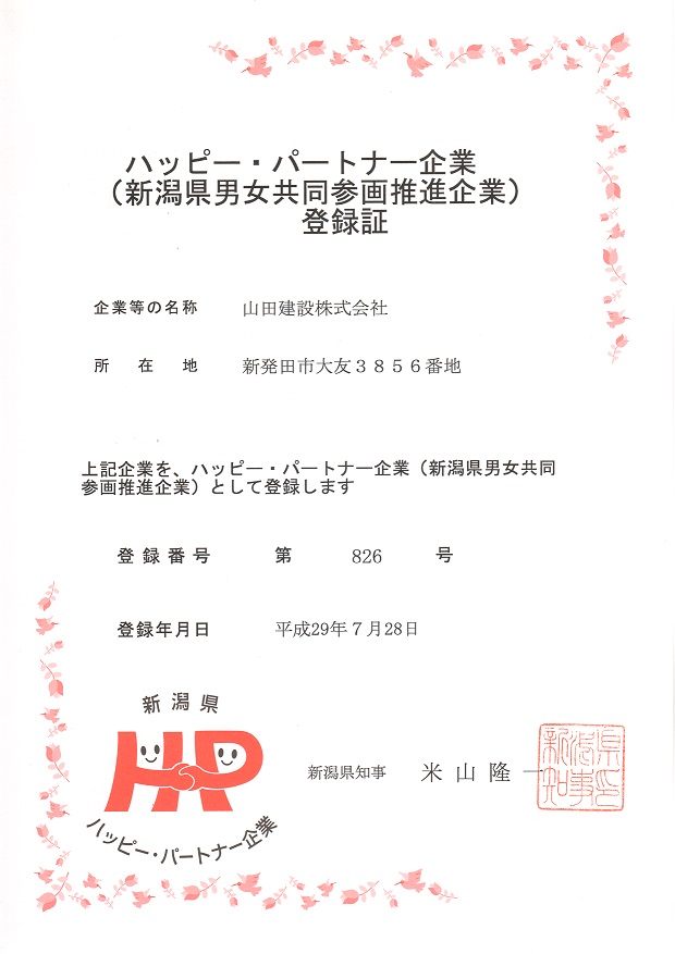 ハッピー・パートナー企業(新潟県男女共同参画推進企業)に登録しました。